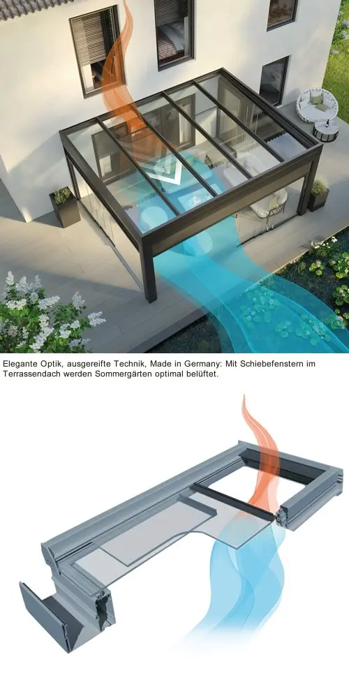 Dachschiebefenster entlassen angestaute Wärme einfach über Ihr Terrassendach. Dachschiebefenster gewährleisten beste Be- und Entlüftung.